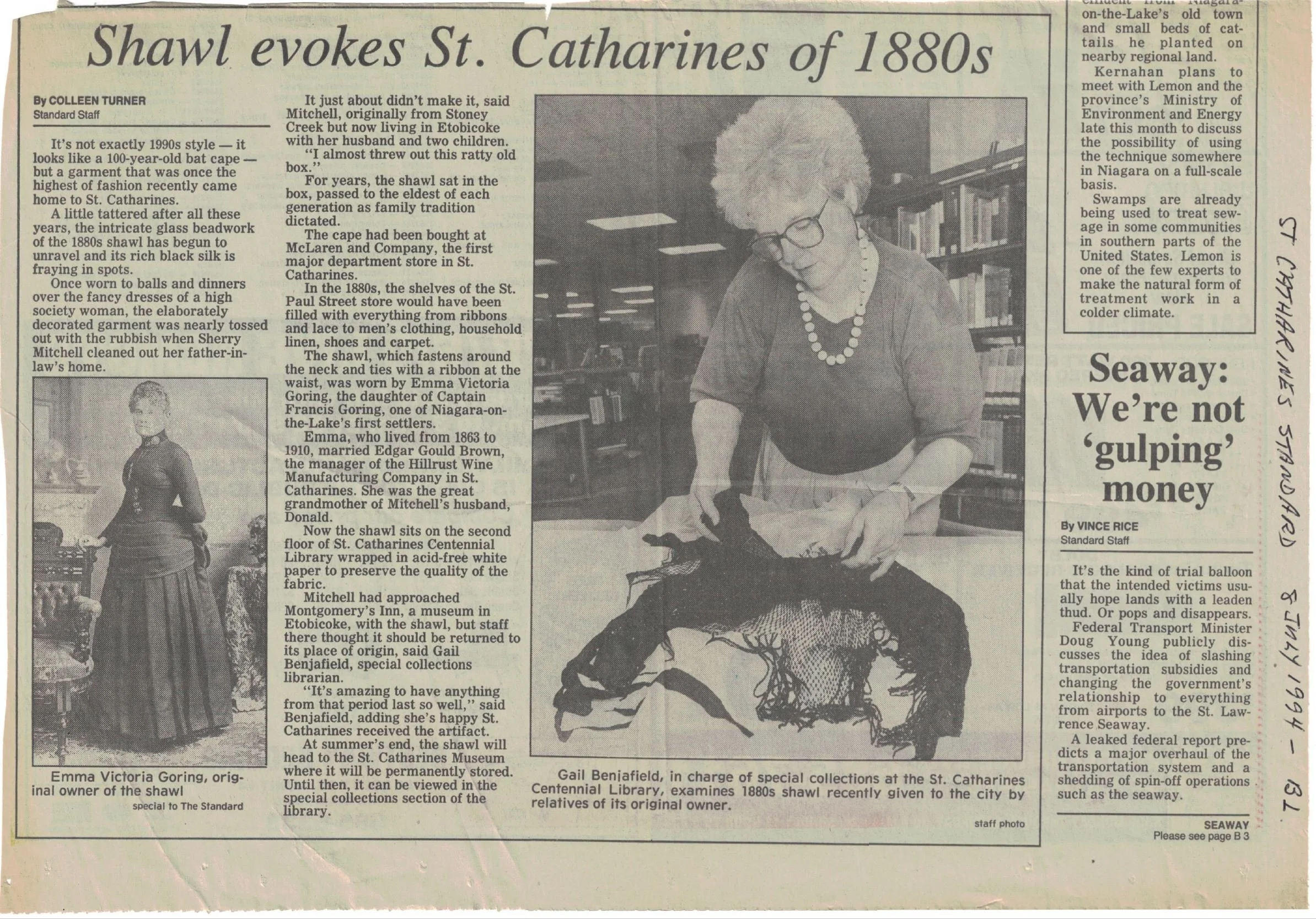 Turner, Colleen. “Shawl evokes St. Catharines of 1880s.” The St. Catharines Standard, July 8, 1994.