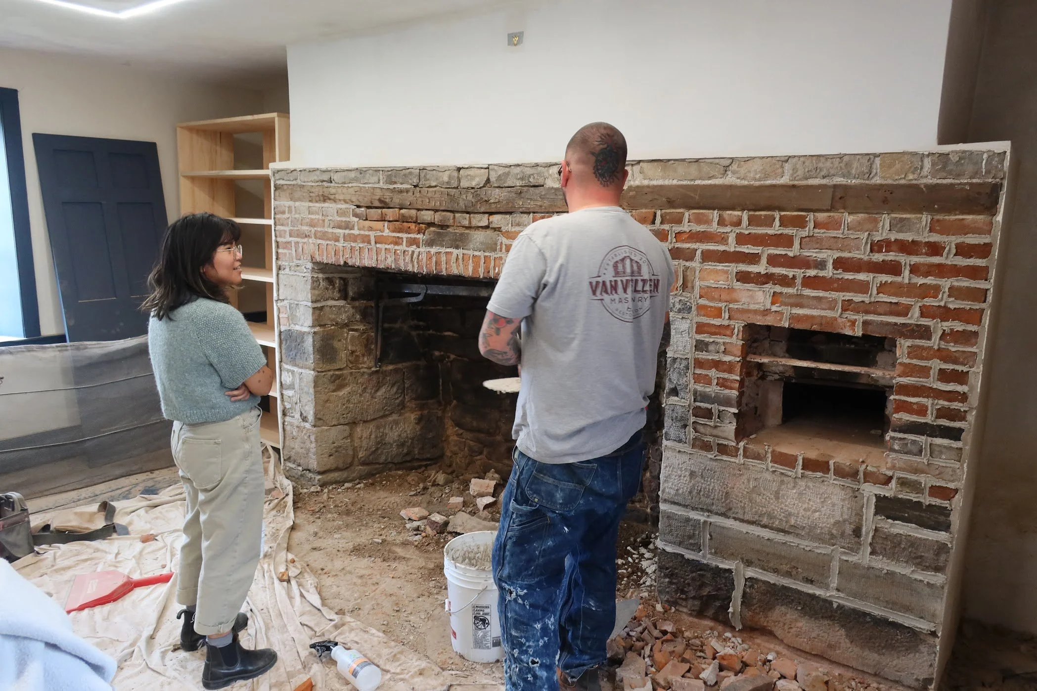 Pam learns how to repoint masonry from heritage mason Patrick Van Velzen. The Brown Homestead, 2023.