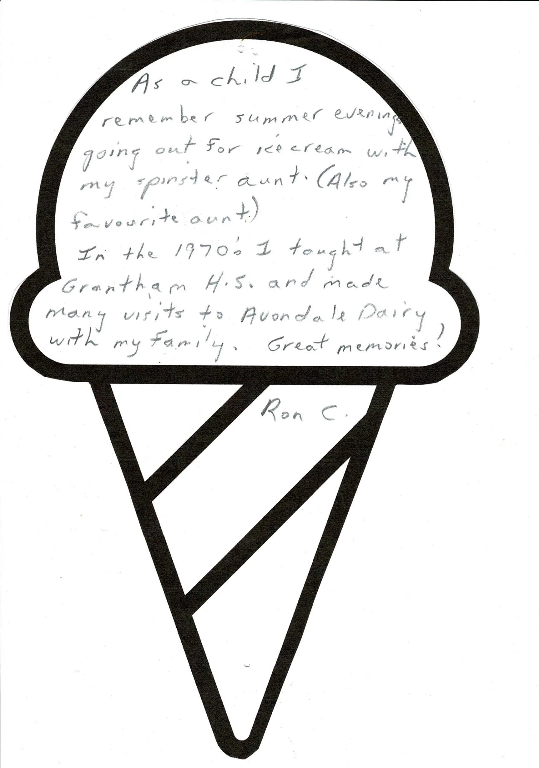 “One of my *dad’s favourite expressions in the summer was ‘I Scream, You Scream, we all scream for Ice Cream’. We often went out for ice cream as a family to Rainbow Dairy in Niagara Falls. Yum! I also remember getting Mello Roll ice cream cones in Fonthill, but I didn’t like nearly as much.