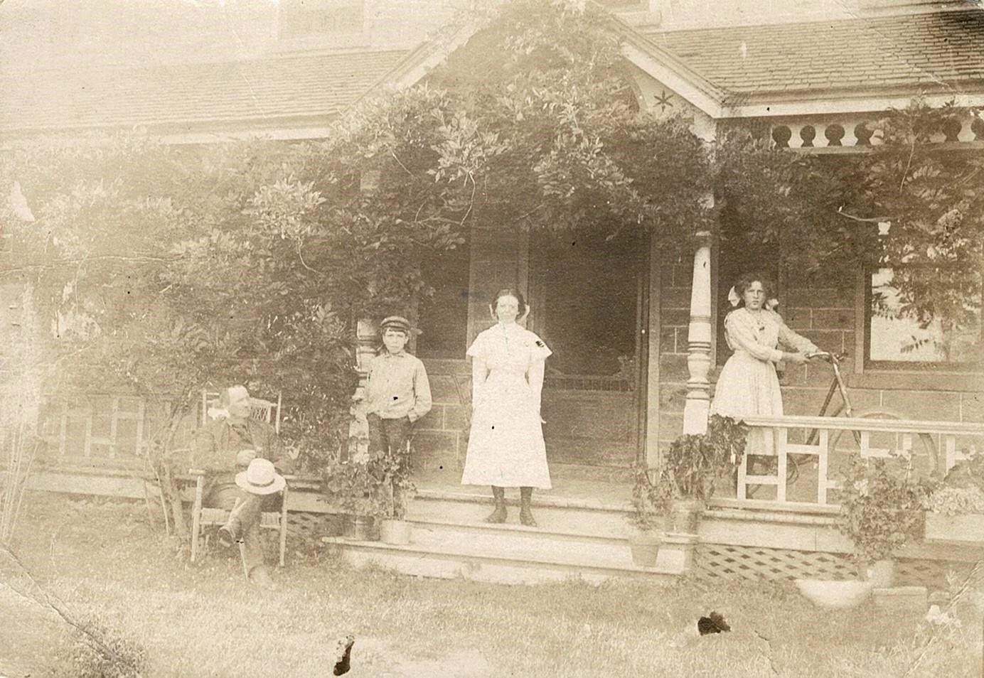 Lafontaine, Charlie, Annie and Mabel Powers (L to R) pose around the front porch of the John Brown House, c. 1910. Photo courtesy of Ethel (Powers) Simpson.