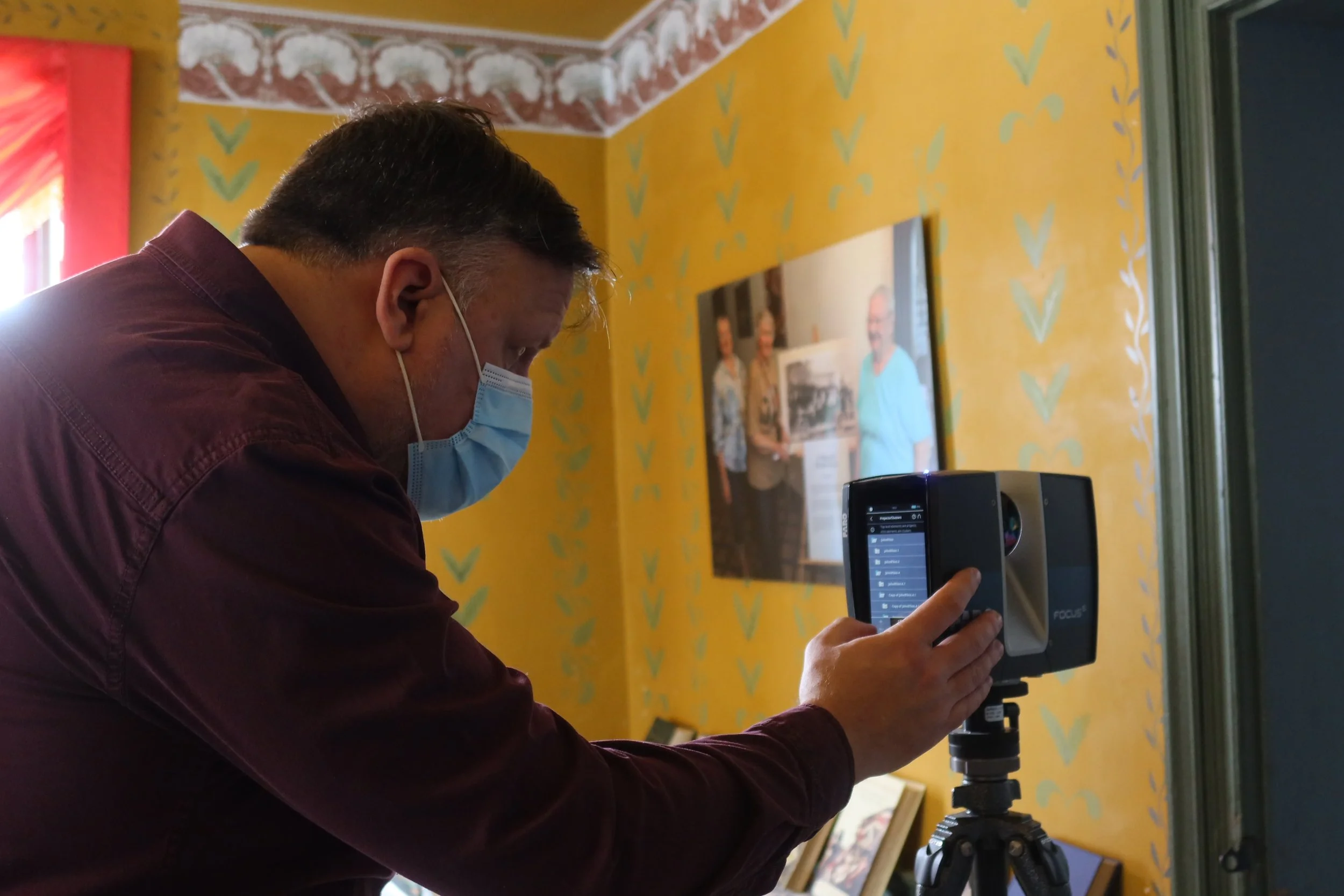 This application was made possible through the careful documentation and conservation of the physical wallpaper pieces, as well as photographs of the room from every angle and at every stage of rehabilitation. Last year, students from Brock’s Digital Humanities Department used data acquired from Dr. John Bonnett to build a prototype that we show our visitors during house tours. In 2022, Dr. Bonnet used a 3D FARO scanner to create a point cloud that was then converted into a 3D model. This impressive LiDAR (Light Detection and Ranging) technology uses a rotating laser beam to create a three-dimensional, measurable and coloured digital replica of the room. Read more about it in our June 2025 article: