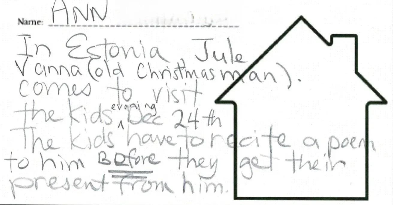 In Estonia, Jule Vanna (old Christmas man) comes to visit the kids evening Dec 24th. The kids have to recite a poem to him before they get their present from him.