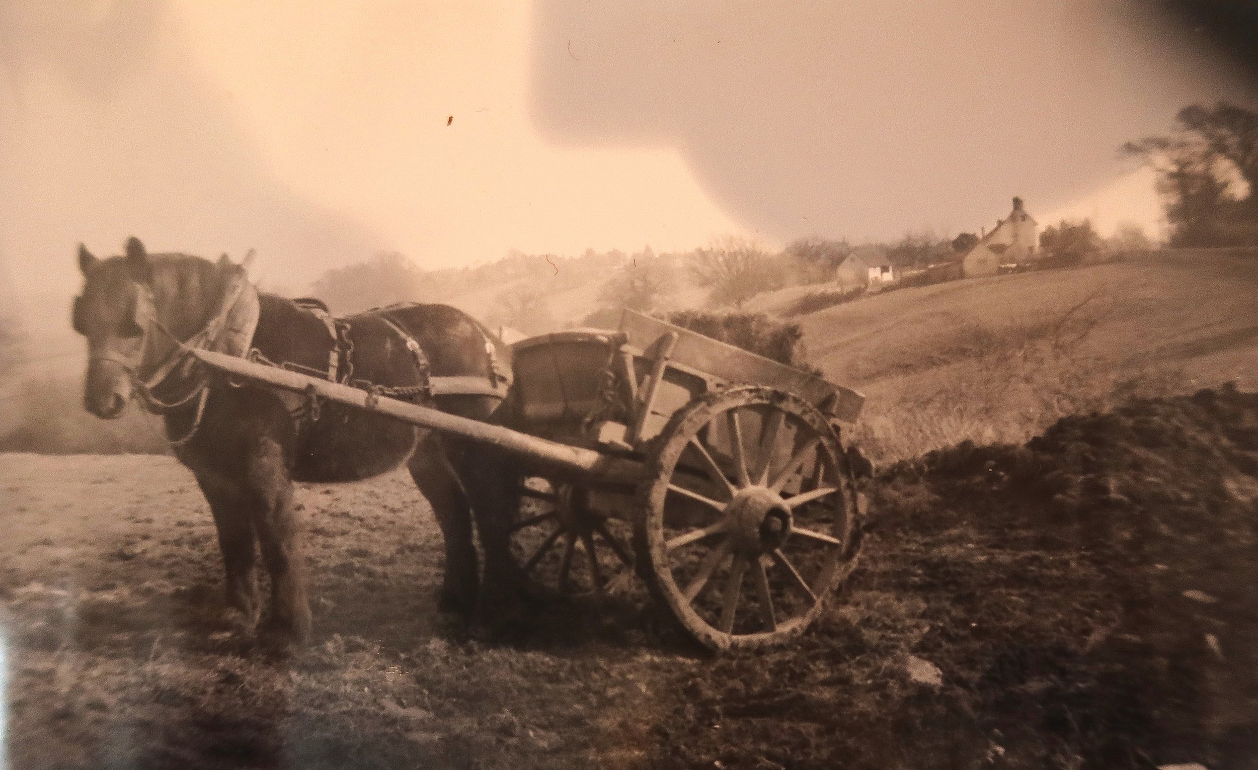 Horse pulling a cart at Downalane Farms. Date unknown.