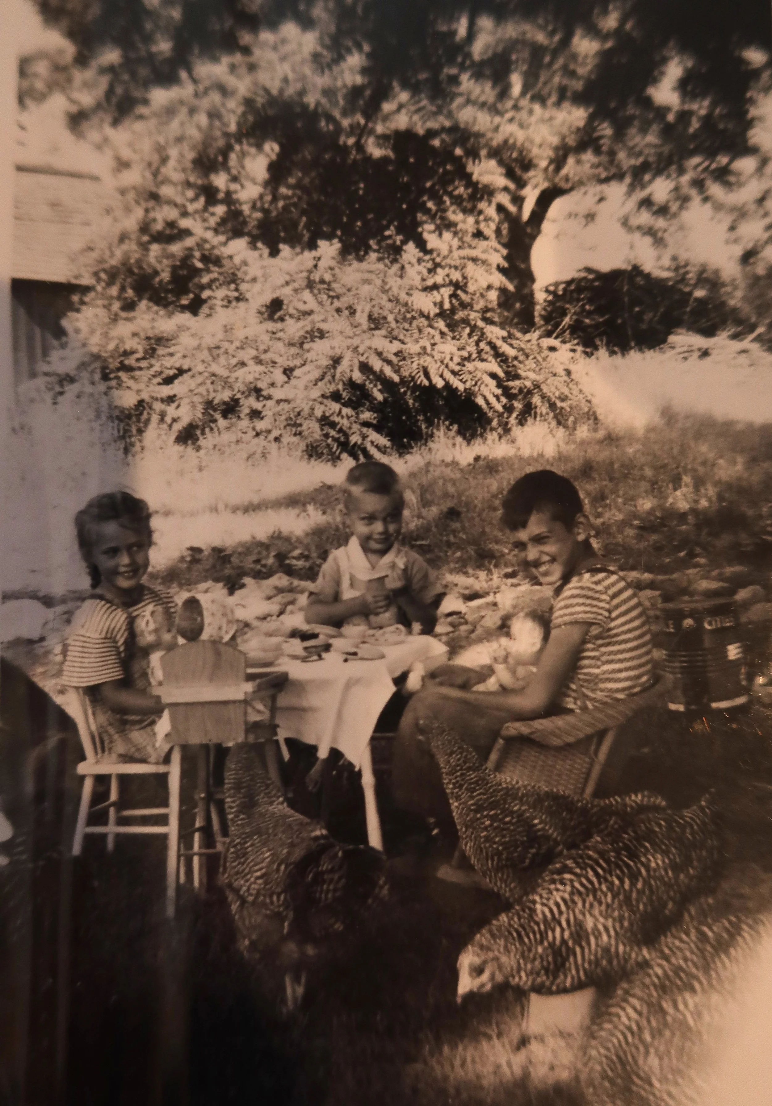 Elizabeth and her brothers Richard and Robert having a picnic on the farm, c. 1948.